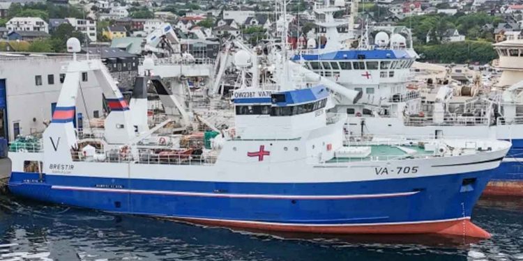 Frysetrawleren »Brestir« ligger stille i Tórshavn – krumtapakslen skal repareres i Norge, og skibet kommer sandsynligvis ikke på havet igen før engang til næste år.